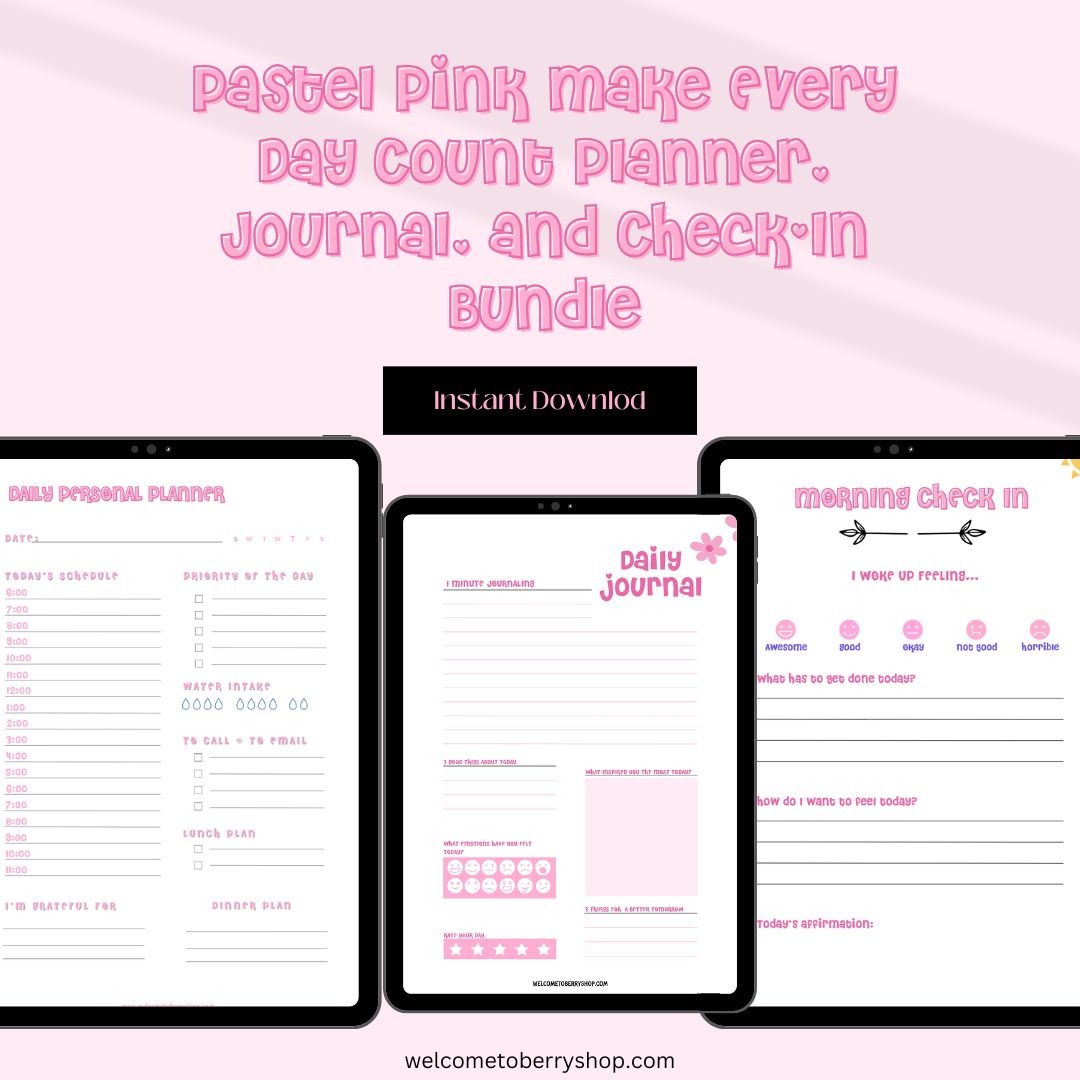 Pastel Pink Make Every Day Count Planner, Journal, and Check-In Bundle