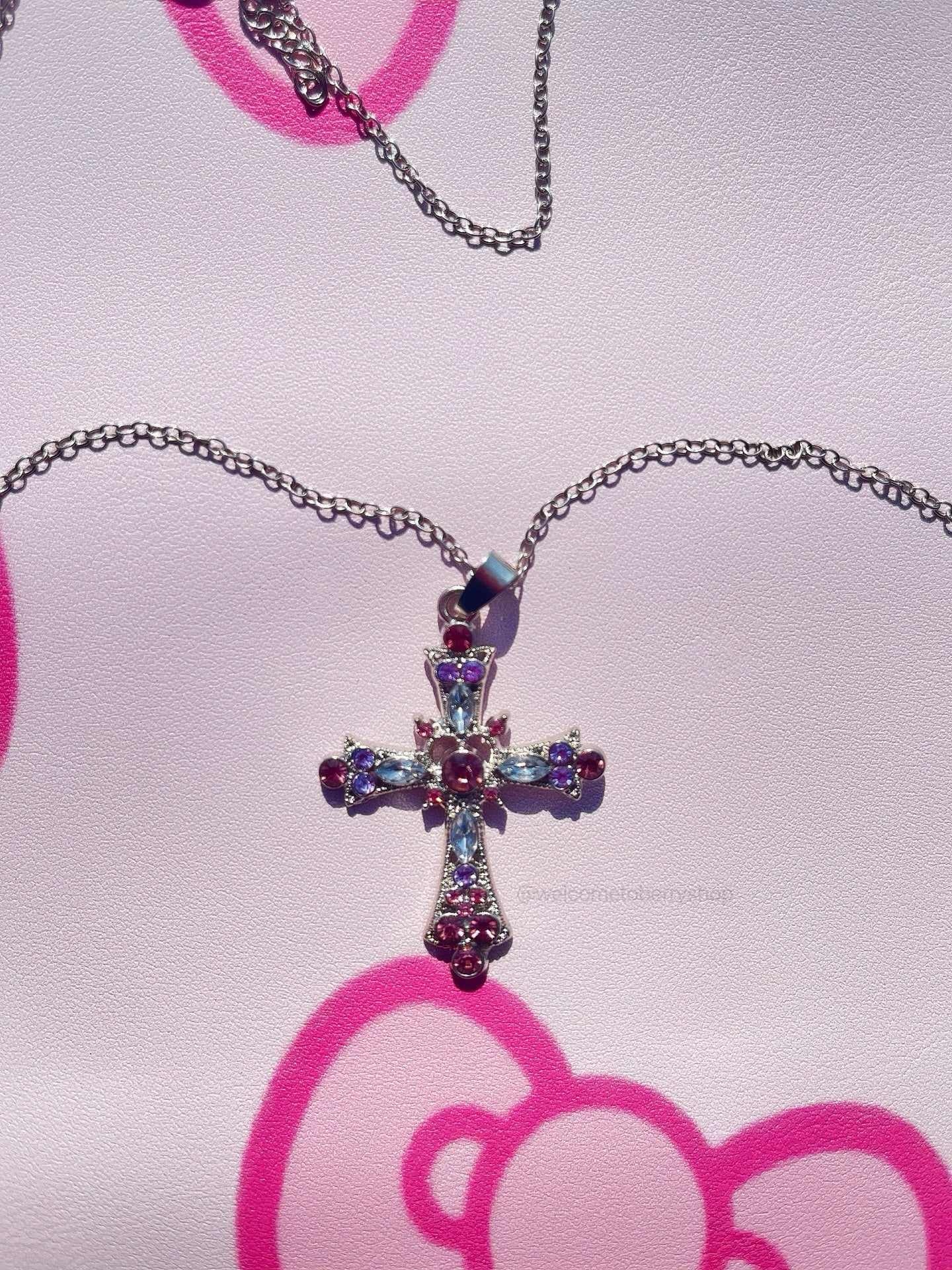 Add a touch of alternative kawaii charm to your look with the Crystal Pink Cross Chain! This stunning necklace features a sparkling pink crystal cross, blending gothic aesthetics with a soft, feminine touch. Whether you're channeling pastel goth vibes or just love eye-catching accessories, this piece is the perfect addition to your collection.